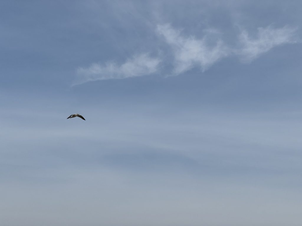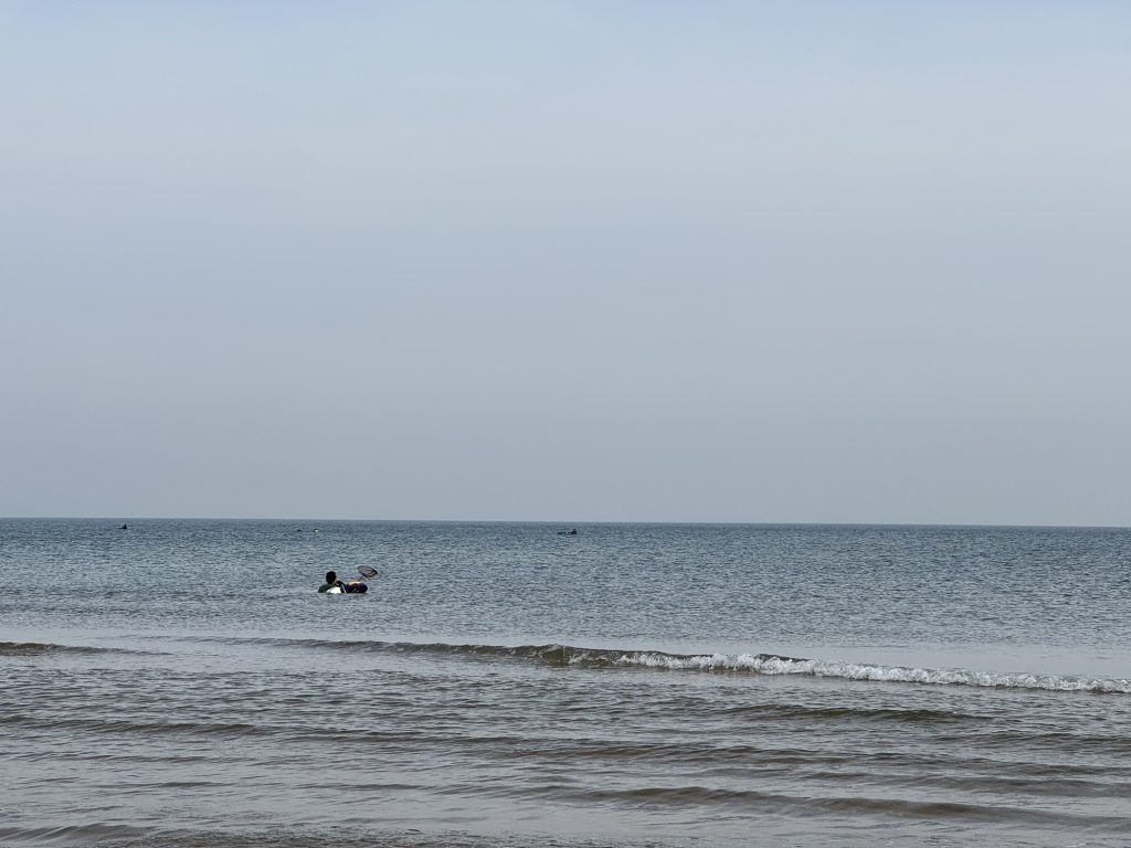 这里初春的海水还是有点冰凉,但是难掩它清澈的蔚蓝,细幼的海沙在海风吹拂下,偶尔飘起一阵阵的风沙,伴随着海浪一起飘舞,天上有晨起觅食的海鸥的身影飞过,一片祥和的景象。
